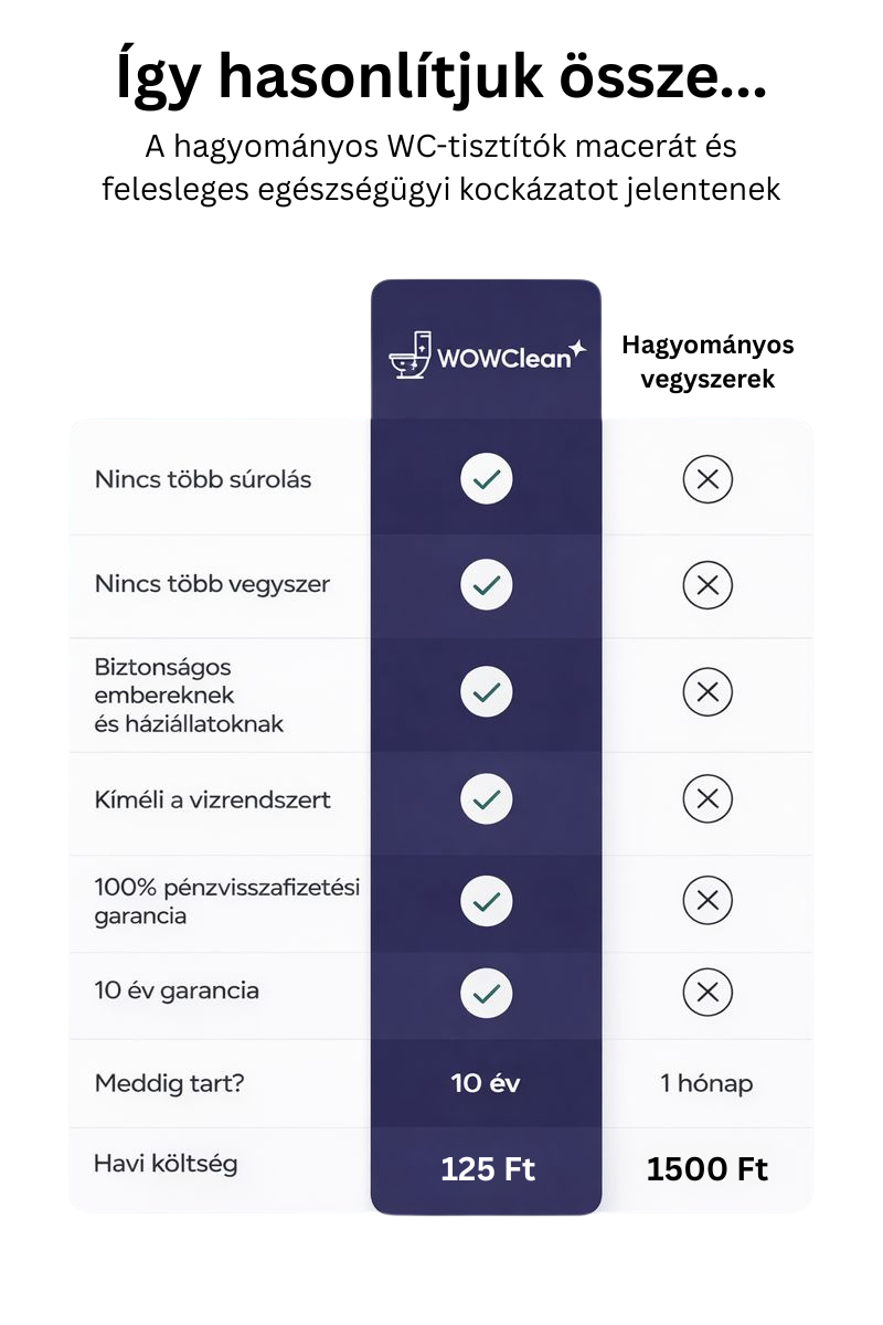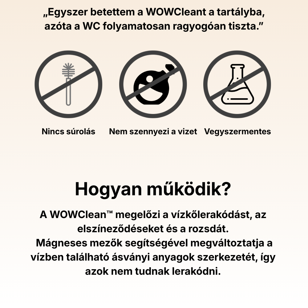 "Szinte minden hónapban újra és újra súroltam, vegyszereztem, mégsem volt tartós az eredmény. A WOWClean óta ez teljesen megszűnt. A WC sokkal tovább marad tiszta, nem jelenik meg a vízkő, és végre nem kell kínlódnom vele. Egyszerű megoldás, ami tényleg megkönnyíti a mindennapokat."
